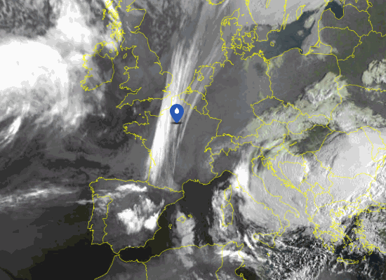 Cette semaine, entre l'anticyclone AA et la dépression sur l'Italie une bande nuageuse et parfois légèrement pluvieuse, s'étendant des Pyrénées à l'ouest de notre pays, est restée assez statique et nous a influencé par moment en petites salves pluvieuses: