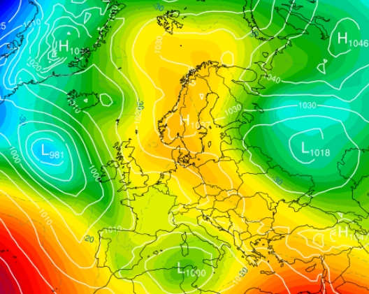 La semaine prochaine, via un anticyclone allant de la Scandinavie aux Balkans, de l'air assez froid et sec continental venant de l'Europe de l'Est, où y règne un hiver rude, va s'installer pour la semaine avec un temps plutôt lumineux: