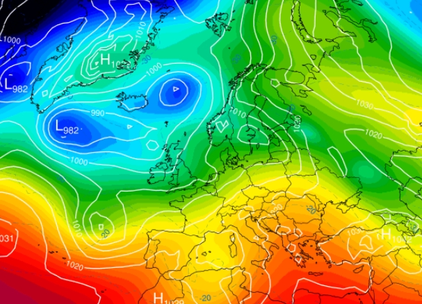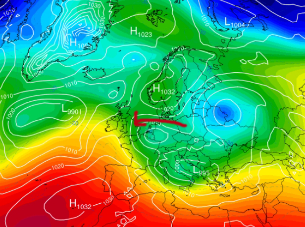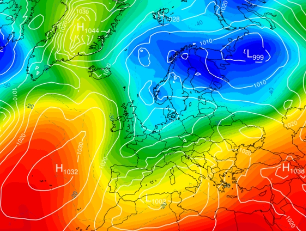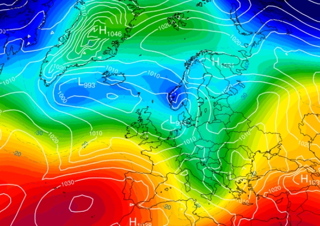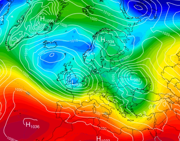 Semaine du 05-01-26 au 09-01-26 Le WE, la dépression va se décaler vers le SE et à l'arrière de celle-ci, nous allons nous retrouver en retour d'Est avec un air plus froid accompagné d'averses hivernales (en rose et bleu ligné sur le modèle). Dimanche, le temps sera plus calme, plus sec et bien froid: