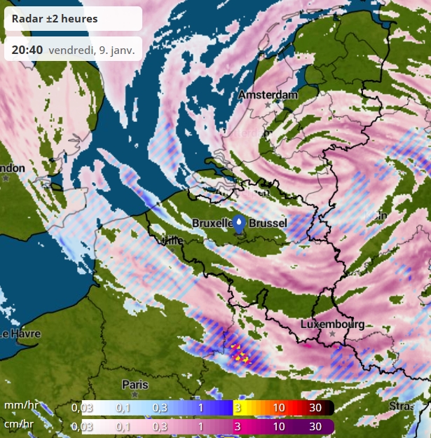 Samedi: la dépression se comblera sur le continent mais il subsistera une importantes couverture nuageuse. Elle sera porteuse de chutes de neige (fondante) continues avec une accumulation possible, cela dépendra des T° au sol qui baisseront en journée. Le vent se calmera. En cours de soirée, le temps redeviendra sec. Minima à 1°C, maxima à 2°C. Dimanche: sous l'effet d'une hausse du champ de pression, le temps sec s'imposera sur tout le pays. Il fera bien plus lumineux, mais le fond de l'air restera froid dans un flux continental. Minima à -4°C, maxima à 1°C. Périodes du WE les plus favorables pour les activités extérieures: dimanche ! Tendances pour la semaine: le temps froid du WE va rapidement s'estomper et nous allons nous retrouver dans un défilé de perturbations océaniques.